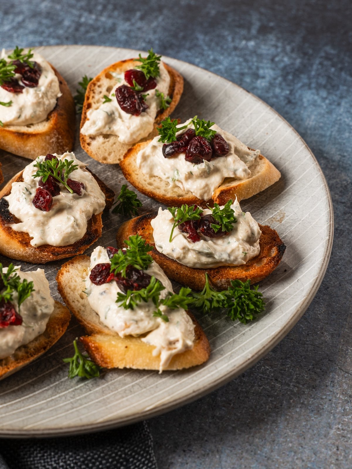 A light, creamy pâté-style starter, finished with a tangy cranberry topping and a subtle lift from sushi ginger. Ideal for summer entertaining or an easy pre-dinner bite.